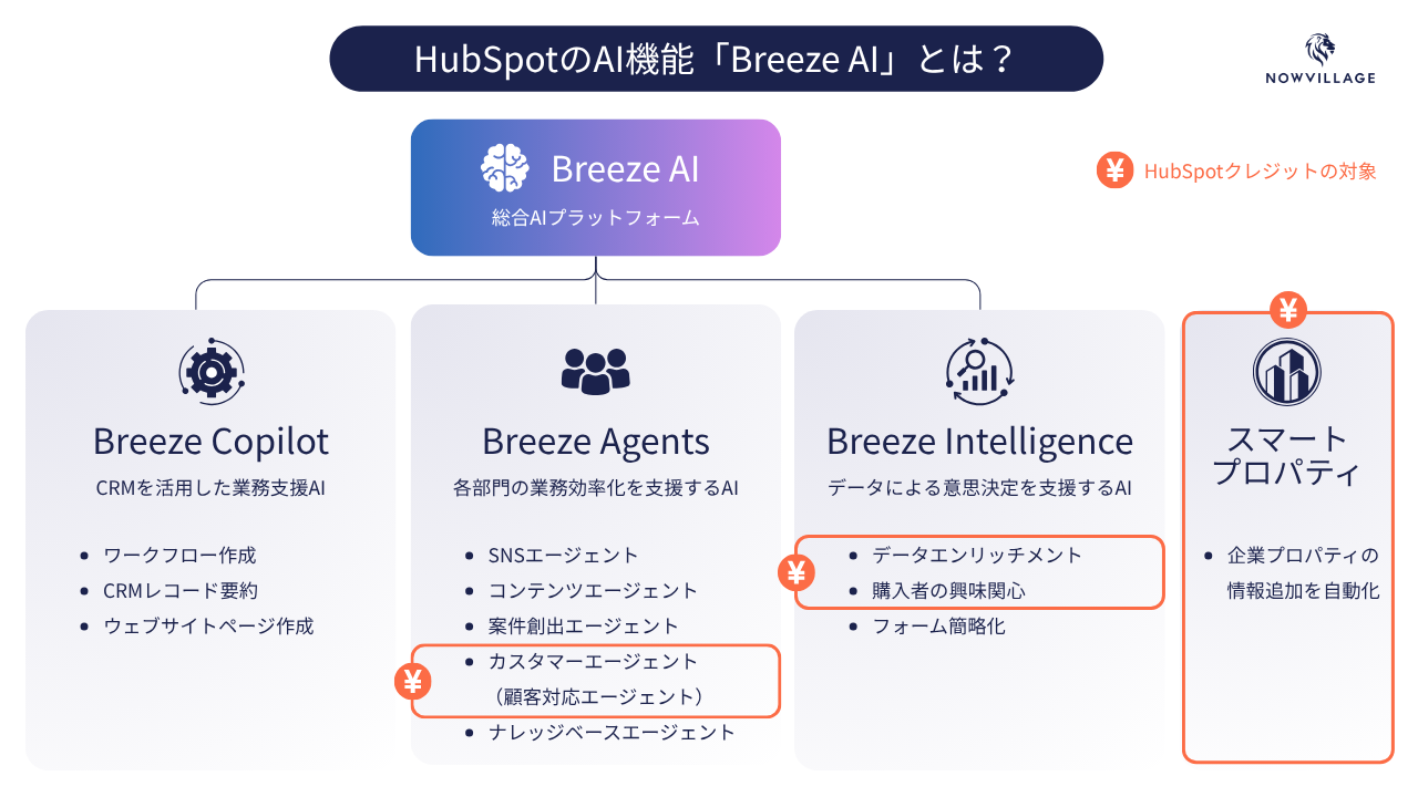 HubSpotクレジットとは、HubSpotが提供しているAI機能「Breeze AI(ブリーズ・エーアイ)」シリーズのうちの一部機能と、スマートプロパティに適用される新たな料金体系です。