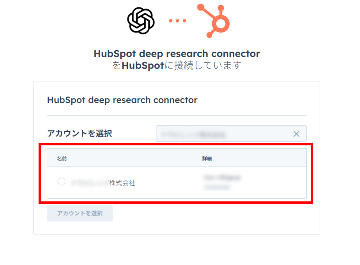 ⑥「HubSpot deep research connectorをHubSpotに接続しています」の画面で、接続したいHubSpotアカウントにチェックを入れ、[アカウントを選択] をクリックする