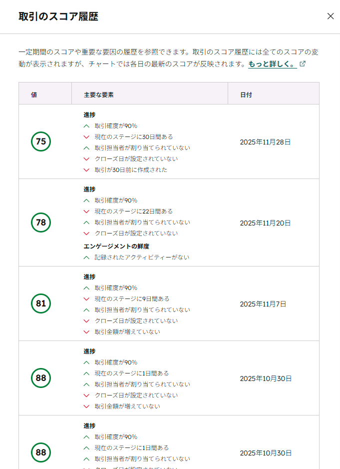 「ステージは進んでいるのに、取引スコアが下がっている」という現象は危険信号です。 顧客の関心が薄れている、あるいは競合の動きがあるなどの兆候をAIが検知している可能性があります。